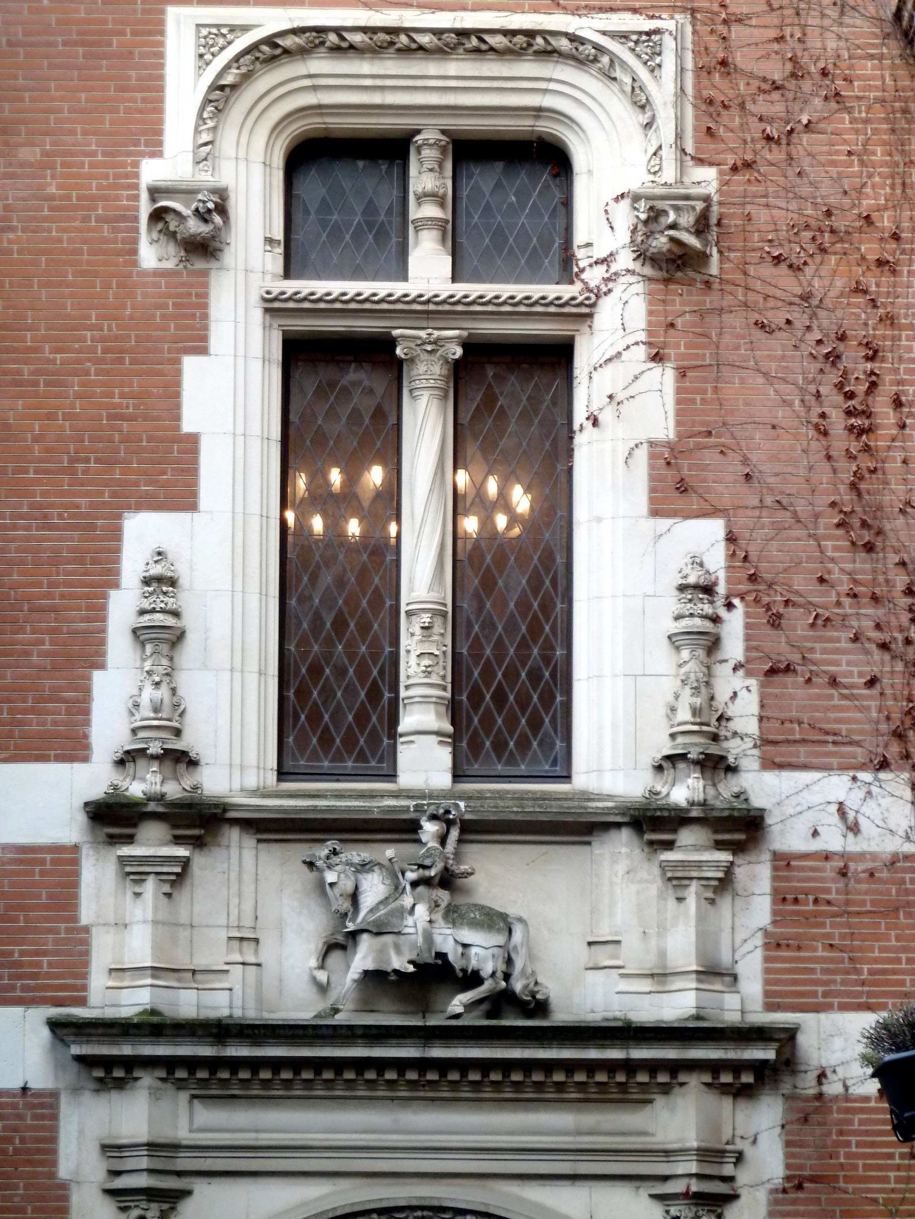Derrière le chevalier on trouve la cage d’escalier donnant, à gauche, sur une grande pièce avec des fenêtres de dimensions réduites qui sont équipées de vitraux incolores -encore à losanges assemblés au plomb- comportant un petit médaillon décoré de morceaux de verre colorés. Dans le bâtiment principal, à droite, quelques grandes fenêtres sont équipées de verrières à losanges en verre incolore (entre 1898 et 1905).