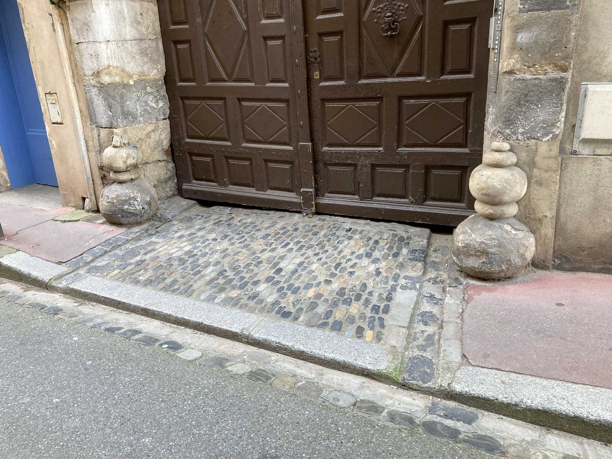 De très nombreux exemplaires persistent dans notre ville sous forme de pièces métalliques en forme d’arc, de boule, de cône ou de motif décoratif original, ou de blocs en pierre dure, sculptés ou laissés à l’état brut, avec une forme inclinée pour rabattre les roues vers l’intérieur.