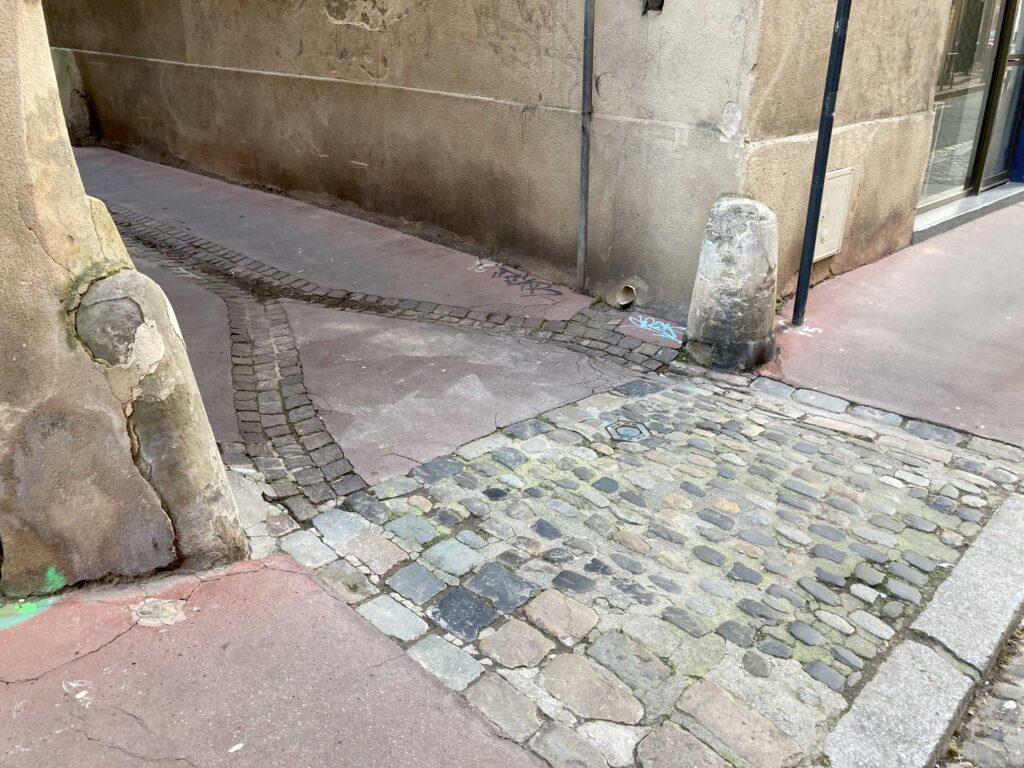 Dans la courbe de la petite rue Saint-Lazare, à deux pas de la place Jeanne d’Arc, trônent sur les trottoirs, six étranges pierres en partie peintes en blanc (photo 1). Elles ne sont pas particulièrement décoratives ; leur seule spécificité, outre leur emplacement assez inhabituel, étant leur forme inclinée. Recherche faite il s’agit de bornillons faisant partie de la grande famille des chasse-moyeux.