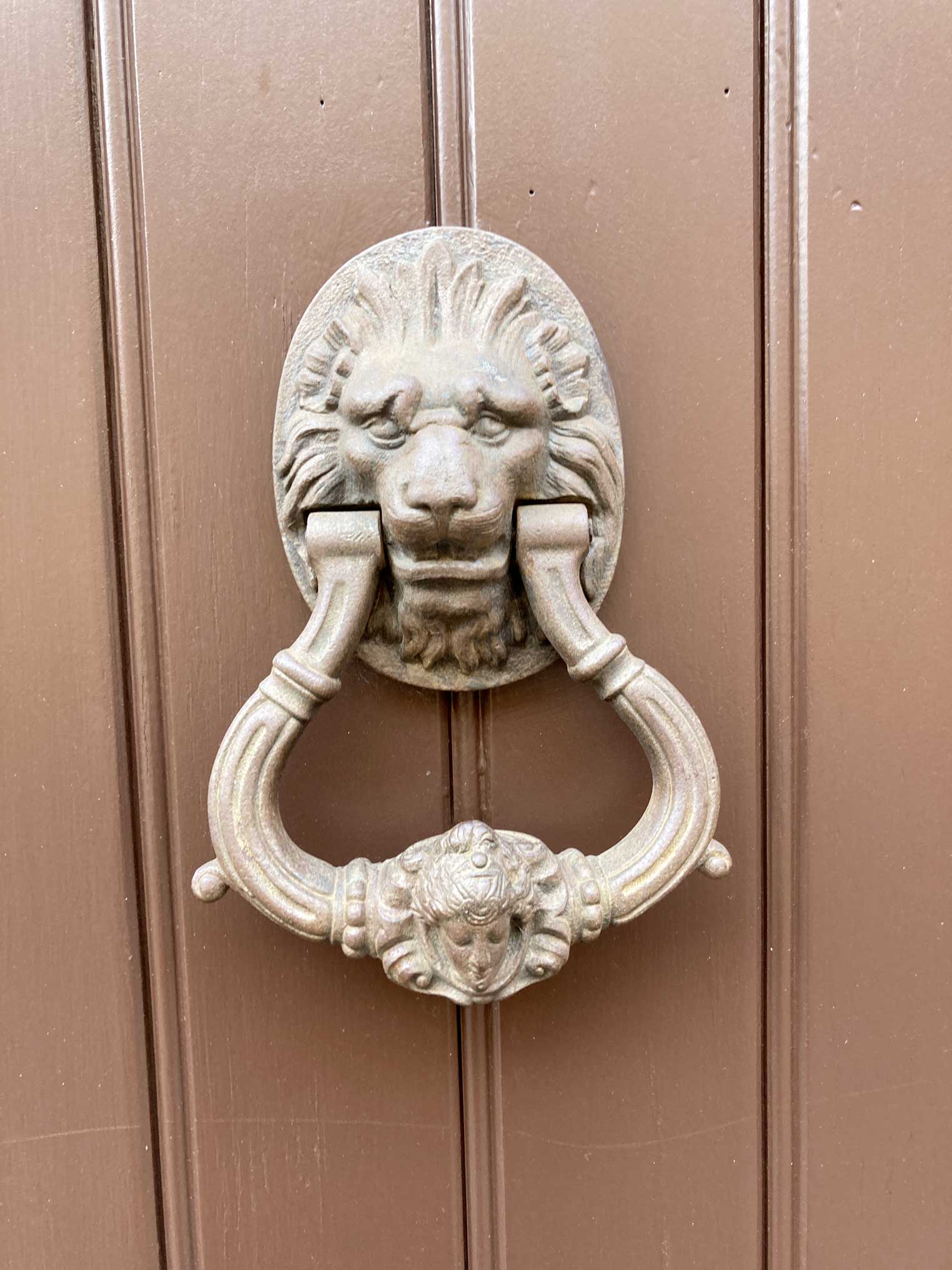 Dans notre quartier, la majorité des heurtoirs sont des mains. Je n’ai trouvé, au détour de mes promenades, qu’un seul anneau (photo1) dont l’état laisse à penser soit à une très belle conservation, soit à une fabrication assez récente et que trois marteaux (photo 2, 3, 4). Mais ma quête n’est pas exhaustive. Apparues au début du 19e siècle, ces mains sont intéressantes car très différentes les unes des autres. Mains gauches (photo 5) ou droites (photo 6), avec une bague à l’annulaire (photo 5) ou au majeur (photo 6). Et cette boule dans la main (photo 7) ? Il s’agit la plupart du temps d’une pomme. Souvent féminines, ces mains peuvent être aussi très masculines, avec des veines fortement apparentes… Or, dans l’antiquité, les médecins grecs pensaient qu’une veine reliait l’annulaire gauche au cœur, veine qu’ils surnommaient la veine de l’amour. La main symbolise l’accueil et la bague sur l’annulaire cette veine de l’amour ! Enfin, sachez observer les poignets de ces mains : certains sont simples, mais beaucoup sont très travaillés et rarement identiques.
