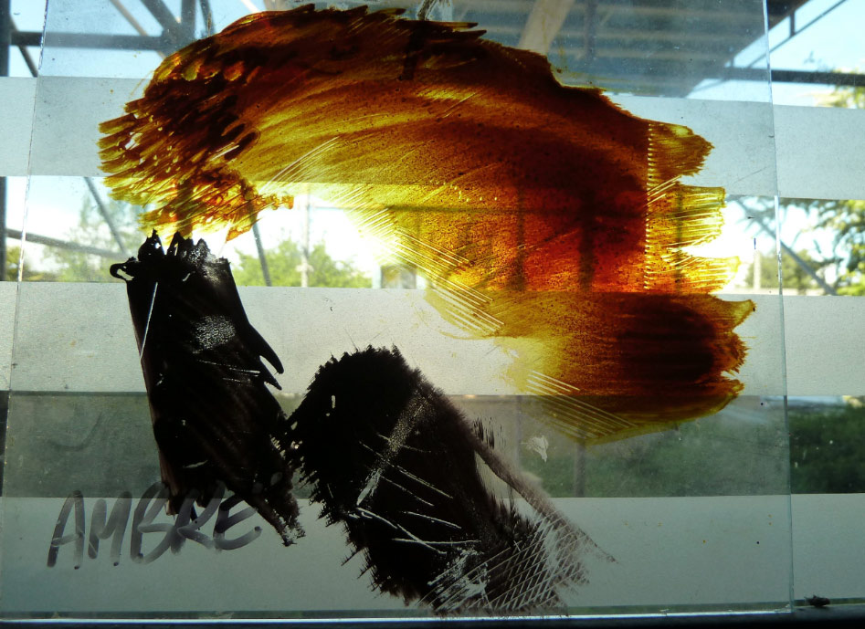 Jaune d'argent : en bas couleur anthracite avant cuisson, en haut couleur ambre après cuisson à 650° (atelier Bataillou)